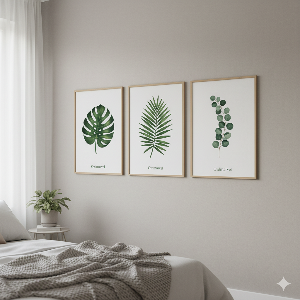 Bring a touch of nature indoors with the Owlmarvel Botanical Poster Set. Featuring elegant illustrations of green leaves and tropical plants, these posters are printed on premium matte art paper for a refined finish. Ideal for bedrooms, living rooms, or study corners, they create a refreshing and calming atmosphere. The minimalist design ensures they blend seamlessly with modern or Scandinavian interiors.